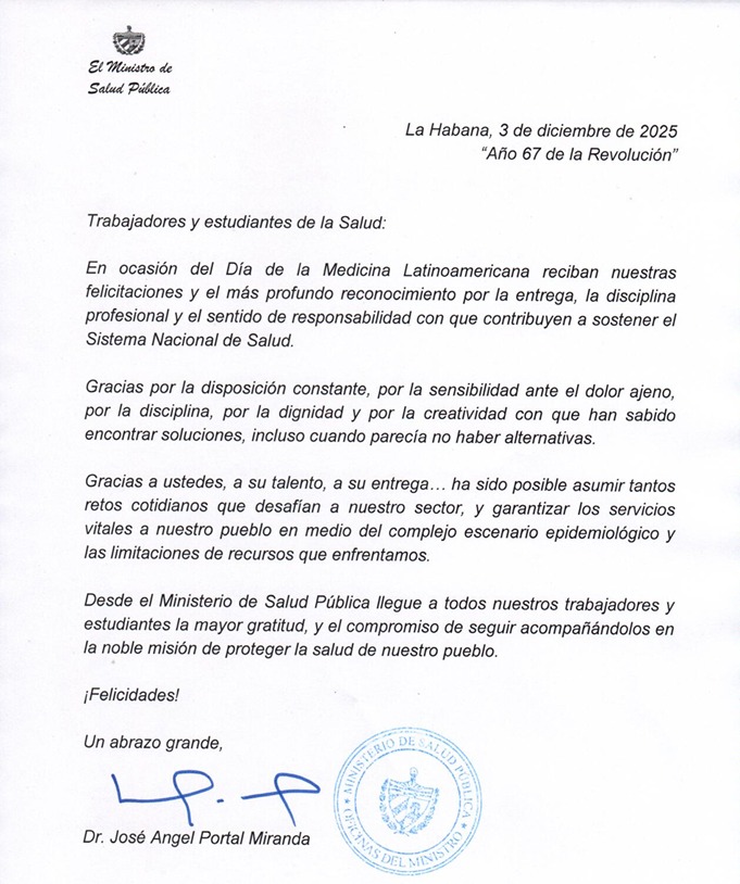 Y celebramos a quienes, en Cuba, con bata blanca y corazón noble, enfrentan el complejo escenario epidemiológico actual marcado por el aumento de enfermedades transmitidas por vectores y la circulación simultánea de diversos virus respiratorios, y mantienen vivo el espíritu de la medicina latinoamericana, sosteniendo la salud del pueblo.