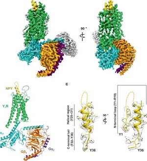 El neuropéptido Y (NPY) es muy abundante en el cerebro y está involucrado en varios procesos fisiológicos relacionados con la ingesta de alimentos y la ansiedad, asà como con enfermedades como la obesidad y el cáncer. Sin embargo, los detalles moleculares de las interacciones entre el NPY y sus receptores son poco conocidos. Este artÃculo informa sobre una estructura de microscopÃa crioelectrónica del receptor de neuropéptido Y1 unido a NPY (Y1R) en complejo con la proteÃna Gi1. El segmento C-terminal de NPY que forma la conformación extendida se une profundamente al núcleo transmembrana Y1R, donde el residuo C-terminal amidado Y36 de NPY se encuentra en la base del bolsillo de unión al ligando. Además, la región helicoidal y dos residuos N-terminales de NPY interactúan con los bucles extracelulares de Y1R, lo que contribuye a la alta afinidad de NPY por Y1R. El análisis estructural de Y1R unido a NPY y los estudios de mutagénesis proporcionan información molecular sobre el mecanismo de activación de Y1R tras la unión de NPY.