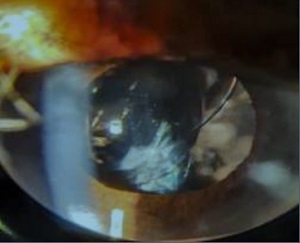 El ojo izquierdo carecÃa de visión a causa de un rechazo al trasplante corneal penetrante que le fue realizado. El ojo derecho presentaba edema macular con subluxación de la lente intraocular.