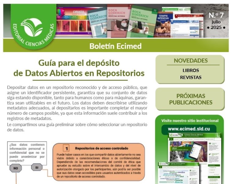 El N.º 7 / 2025 del BoletÃn Ecimed presenta un acercamiento a la estrategia para el depósito de Datos Abiertos en Repositorios, garantizando asà que sean utilizables para otras investigaciones en el futuro.